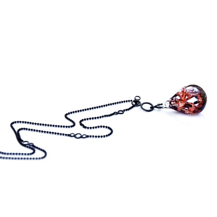 Oxidised silver, glass, wood & copper leaf. Hand made chain with asymmetric loop details. Also available in silver & rose. TPMC BOXC